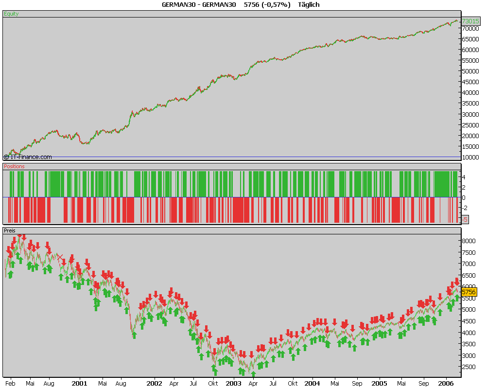 Ich habe die Grafiken für den DAX die du gepostet hast näher betrachtet! Die Kapitalkurve korolliert stark mit dem Underlying. Wie sieht es im fallenden Trend und in Konsolodierungsphasen aus?Wie ist das Money Management gestaltet: Reinvestition,feste Stückzahl,fester Kapitalanteil,immer Startkapital? Wie verläuft der Test an einer 10 Jahres Historie?Wurde optimiert ,da GD overcross 19/33 ungewöhnlich ist?!