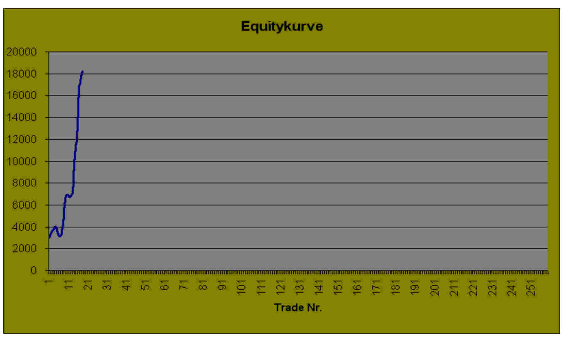 schau dir mal die Equity Kurve an, diese System läuft seit 22.02.05. mit 10 CFD's eine Kreation von mir und Tom ..die wird ein Jahr getestet bis sie real getradet wird...also wahrscheinlich erst im Jahre 2006 im Februar, hängt von der Performance ab.