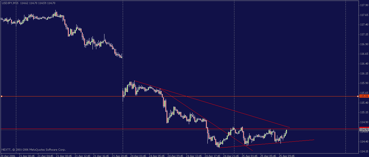 Da ich mich mit dem Forexhandel noch nicht lange beschäftige, habe ich mir ein Demokonto eröffnet. Hier möchte ich dann auch meine Trades mal posten. Im Moment schaue ich nur auf den EUR/USD. Ich habe aktuell einen Stopbuy bei 1,2349 liegen. Das Hoch von heute sollten wir nochmals sehen. Schauen wir mal was passiert. Das Kurziel von ca. 1,2415 haben wir erreicht. Aus dem absteigenden Keil nach unten vom: Hoch vom keil 19.04.06 21:00 h und die Differenz vom 19.04.06 16:00 h. ergab 109 pkt. Kursziel.